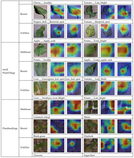 PlantVillage (large and small) [37], available at https://data.mendeley.com/datasets/tywbtsjrjv/1 (accessed on 6 April 2021). PlantSeedlings [36], available at https://vision.eng.au.dk/plant-seedlings-dataset/ (accessed on 6 April 2021).