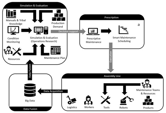 Wired or wireless networks and sensors continuously collect temperature, position, humidity, vibration sensors, Radio Frequency Identification (RFID) and internal processes such as built-in-test capabilities, performance, health status and equipment usage. The acquired data sets are successively stored in a centralized big data warehouse. The information is standardized and structured for the simulation and evaluation stage to prescribe and schedule maintenance tasks in real time and keep the assembly line functioning at the required performance through data fusion.