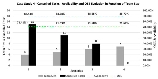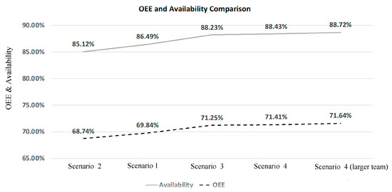 A more global parameter is used to better compare the different cases presented in this work. This parameter is the OEE that takes into account availability, performance, and quality. For all effects in this work, the performance and quality are considered constant; thus, the availability can be more efficiently compared.