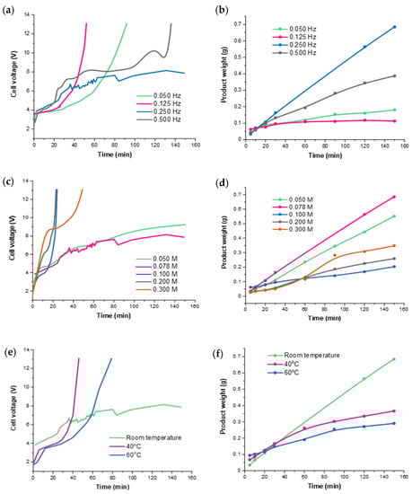 | Frequency (Hz) | Product on the Electrodes (g) | Product in the Solution (g) |