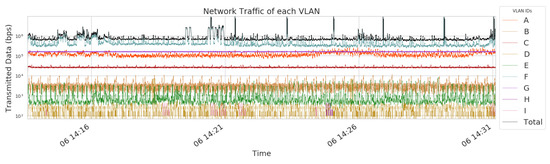 Traffic per Virtual Local Area Network (VLAN); illustrated in logarithmic scale.