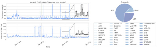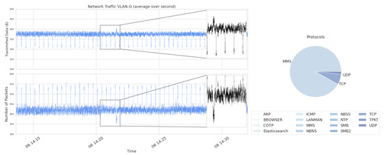 In Figure 8, the number of packets and the amount of data transmitted in the server network (VLAN-F) is shown as well as the distribution of different protocols. In this VLAN, it can be observed that both the number of transmitted packets and the average size of the payload vary over time. However, from the lower part of the figure, it can be seen that approximately 2000 packets per second is a base-load, with occasional traffic peaks. This behavior could be explained by the fact that the operator stations are subscribing for periodic status updates with a limited variation in packet size, from connectivity servers. The periodic updates would then serve as the base-load in the server network. The variations are then an aggregate of the various protocol types shown on the right-hand side. An example of sporadic traffic is when the operators change the process views on their screens to a different section of the process. This change causes traffic bursts due to requests to start and stop subscriptions of information corresponding to the previous and new process view. Another example can be when the operators transmit and receive production data to the Manufacturing Execution System (MES) or other information to file servers or similar. Generally, this sporadic traffic has a larger packet payload, shown in Figure 8.