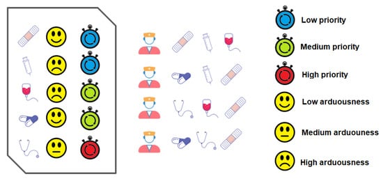 Each job has a priority and arduousness score [25,26]. The lowest score means that the job has a low priority/arduousness. Sometimes, jobs have to be postponed until another day because no caregiver can perform the job on the current day or because of a lack of time. The priority scale is used to range jobs from basic to extremely important. Some jobs are more arduous than others (palliative care), and the caregiver can be affected by this job. These situations must be taken into account when building and scheduling the planning. The arduousness score is used to rate how much a job can affect a caregiver from low impact to deep impact. As an example and as illustrated in Figure 1, the first caregiver has three jobs scheduled. The first one has a low priority and a low arduousness level. The second job scheduled has a low priority and a high arduousness level. The third job scheduled has a medium priority and a high arduousness level. Taking care of how jobs are scheduled is important because as described in Figure 1, the first caregiver has to perform two jobs with the highest arduousness score, whereas the fourth caregiver only has jobs with a medium or low arduousness score.