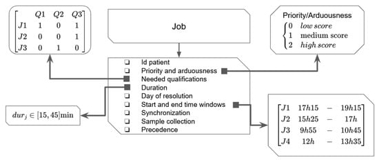 Figure 3 sums up and exemplifies the characteristics of a job. First of all, a job is related to a patient. It has a priority and arduousness score indicating how the job must be scheduled. Then, a job requires skills to be performed. Each job has a fixed duration and must be started within a certain time frame on a specific day. Lastly, if a job may need another caregiver or produce a biological sample, synchronization or collection constraints are raised. Precedence constraints can also be raised if a job has to be performed before the current job.