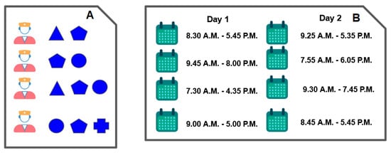Caregiver qualifications’ table (A); starting and ending working hours for each caregiver on a two-day basis (B).