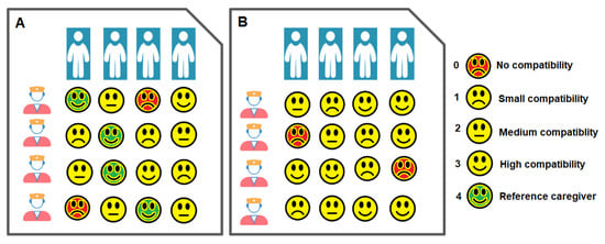 The compatibility between a patient and a caregiver can be found in the literature as a constraint. They are many ways to tackle these compatibilities: caregivers can have a preference for some jobs, time windows, and patient relationship. A caregiver can choose simple jobs rather than difficult jobs such as palliative care. Caregivers might refuse to perform any of the patients’ jobs for compatibility reasons. Two compatibility tables are stored to show how much a caregiver is compatible with a patient. The first compatibility table (A) in Figure 5 combines all hard constraints of a caregiver’s/patient’s compatibilities (e.g., if the caregiver has a dog allergy or spoken languages). The second compatibility table (B) in Figure 5 shows low constraints in a caregiver/patient relationship. A score of zero is the lowest feasible compatibility, and three is the highest. In the hard compatibility table, a score of four is only reachable if the caregiver is a reference caregiver of the current patient. As illustrated in Figure 5, each patient and caregiver has his/her own compatibility. For example, the first caregiver has a reference caregiver compatibility regarding the first patient, bu a medium compatibility for the same patient regarding the low compatibility table. Compatibilities are not mutual, which means that a caregiver can have a good compatibility with a patient, while this patient does not.
