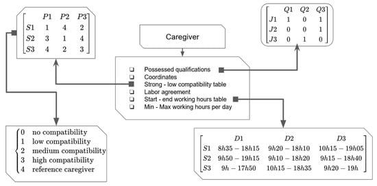 Let be a set of caregivers. As a reminder, the word caregiver is applied to anyone who provides personal care in his/her work, such as nurses or social workers. For each patient, there is at least one set of caregivers able to perform all jobs required by the patient at his/her home. All caregivers’ tours can start at their own homes or at the HHC office and must finish at the HHC office. Traveled distances between patients’ homes and caregivers’ homes are calculated and stored in a specific matrix. For an HHC center, designing the optimal shifts for caregivers can be a difficult task. A shift can be consistent or mixed. In a consistent shift, there is only one type of caregiver (nurses only for example). However, a mixed shift has different types of caregivers (nurses and social workers work together with the patient). In both cases, caregivers are distinguished by their own qualifications and their labor agreement. Each caregiver can accomplish a set of jobs regarding his/her set of qualifications . The labor agreement defines legal working hours. A caregiver can deliver a job only within his/her working hours. The lower and upper bound of availability represent the time frame in which a caregiver is available during the day . As described in Figure 4, each caregiver has a different set of skills, and for each day of the planning, each caregiver has a different time frame for his/her legal working hours.