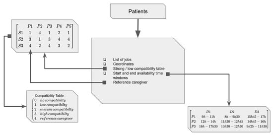 Figure 7 describes the characteristics of a patient. Firstly, a patient possesses a list of care services (jobs). The patient has the geographical coordinates (latitude/longitude) of his/her position. The distance between patients and the HHC center or laboratories is calculated and stored in a matrix. The compatibility table is set up to reflect the caregiver/patient relationship. Time windows are set up to show to the center when a patient is available to receive his/her care services.