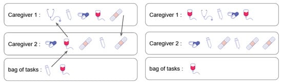 The solving method was based on a descent algorithm. Firstly, the algorithm tries to reduce the bag of non-allocated jobs by switching jobs between caregiver and the bag until the job can insert itself into a caregiver schedule, as described in Figure 9. During this process, the qualification constraint must be respected, as well as the working balance, as much as possible. Compatibility constraints can be raised if necessary. Indeed, for example, a patient can have a low compatibility score with all caregivers. In Figure 9, for example, the algorithm tries neighborhood moves by inserting the first job of the bag in front of the second job of the second caregiver. At the same, it also tries to insert the second job of the second caregiver in front of the first job of the first caregiver. Lastly, the algorithm inserts the last job of the first caregiver at the end of the job list of the second caregiver to produce a correct solution. For more details about the algorithm, please refer to the main article written by Xio et al. [36]. Algorithm 1 presents a pseudo-code version of how the descent local search algorithm works regarding the different inputs.