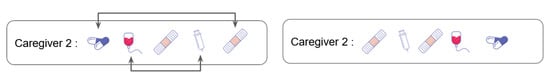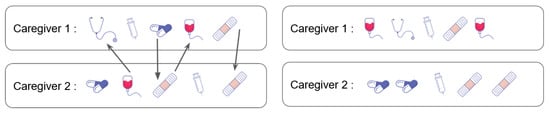 Then, the algorithm tries to balance working hours for all caregivers by minimizing their working hours per day and switching jobs between caregivers to see if a configuration results in a better solution than the current one. As described in Figure 10, two jobs can be switched between two caregivers depending on their qualifications and the patient-caregiver compatibility.