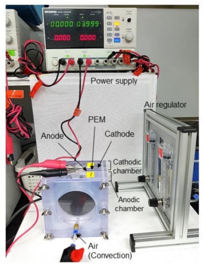 The two-chamber bioelectrochemical system equipped with DC power supply and an aeration control unit [19]. PEM, proton-exchange membrane.
