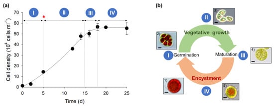 Time course profile of changes in the cell number density (a) and morphology (b) of Haematococcus pluvialis cells during photobioreactor cultivation for 25 days. The life cycle of H. pluvialis is characterized by five types of distinguishable cellular morphologies based on microscopic observation: (1) astaxanthin-rich asexual aplanospore; (2) dividing aplanospore with internal differentiated zooids; (3) green vegetative biflagellate cell; (4) green vegetative non-motile palmella; and (5) astaxanthin-accumulating palmella cell. The asterisk (*) indicates the growth stage of H. pluvialis cells used for the electric stimulation experiment. Scale bars in the optical images represent 10 µm.