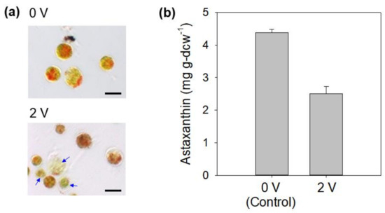 Microscopic image (a) and astaxanthin content (b) in Haematococcus pluvialis cells after electro-treatment at 2 V (current: 3 mA) for 2 days in the cathodic chamber of the two-chamber electrochemical reactor. The blue arrows in Figure 3a represent cells damaged or disrupted by electric stress. Scale bars in the optical images represent 50 μm.