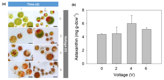 Effects of voltage intensity on the optical morphology (a) and astaxanthin content (b) of Haematococcus pluvialis cells in the anodic chamber of the two-chamber electrochemical reactor. The cellular astaxanthin levels were analyzed after the 2 day treatment. Scale bars in the optical images represent 15 μm.