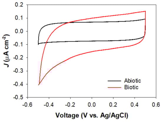 Cyclic voltammograms of the carbon electrode in the presence (biotic, red line) and absence (abiotic, black line) of Haematococcus pluvialis cells in a single-chamber electrochemical reactor with three electrodes. The scan rate was 10 mV s−1.