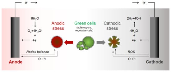 Microbial electro-stimulation can be performed by applying either a cathodic or anodic current in a two-chamber electrochemical system (Figure 1). Anodic current stimulation is useful for controlling intracellular redox balance, such as NAD(P)H/NAD(P)+ balance, in bacteria [25]. Meanwhile, cathodic current treatment has been reported to stimulate the accumulation of reduced biomolecules, such as TAGs and fatty acids (particularly in Chlorella), via electron transfer and/or reactive oxygen species (ROS) generation from the cathode [19].