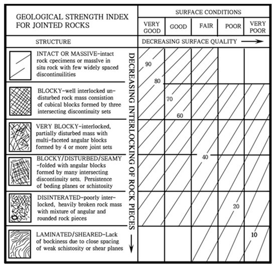 The Geological Strength Index (GSI) system is widely used for estimating the strength reduction from an intact rock to a rock mass, introduced by Hoek [12] in 1994. It is a unique rock mass classification system used as part of the Hoek–Brown failure criterion for estimating the strength and stiffness of a rock mass [21,22]. Accurate estimation of the GSI is important for subsequent calculations [23,24]. As in other rock mass classifications, all the GSI-based equations are highly sensitive to their respective input parameters [25]. Figure 1 presents a chart for estimating GSI for jointed rock masses in the field.