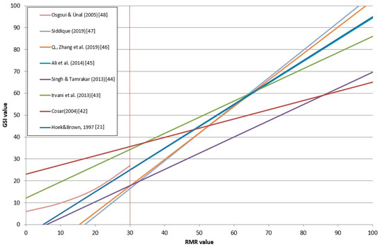 This paper focuses on calculated estimations of GSI from Rock Mass Rating (RMR) values. Recently, several researchers have investigated the relationship between Bieniawski’s [19] Rock Mass Rating (RMR89) and the GSI. Firstly, [21,33] suggested the following calculation: