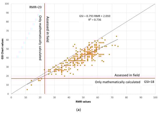 Using the entire database, the two RMR-based different equations of GSI determination (Equations (1)–(5)) and GSI field values were analyzed, based on the observations during the excavation of the Bátaapáti radioactive waste repository. Using the two RMR-based equations, Equations (1) and (3), different correlations were found (Figure 5 and Figure 6). Using Equation (1), the obtained values are always higher than the chart values (GSIchart). There is a linear relationship between the two values: