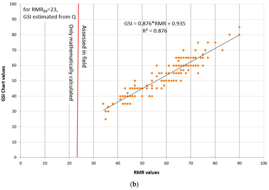 Similarly to the Hungarian granitic rock masses, two types of data exist for Telfer: field values of GSI and RMR89, estimated on-site based on observations from 12–24 m high slope faces (Figure 4), and calculated GSI values from drill core estimations of Q and RMR89 [55].