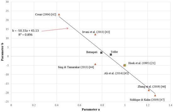 The use of rock-type-based equations and constants from Table 1 did not identify a clear or discernible correlation between RMR89 and GSI. However, further examination of the relationship between ‘a’ and ‘b’ constants indicate a strong correlation for individual cases. The connection between a and b constants obtained from Equation (4) are illustrated in Figure 8.