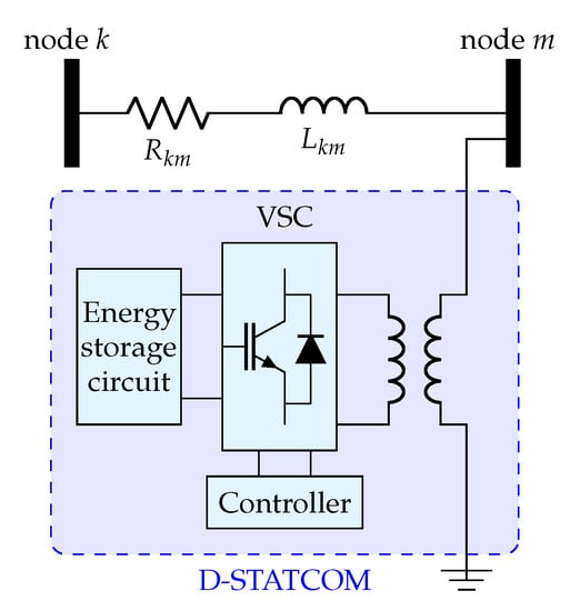 Electric distribution networks represent the majority portion of electrical power systems, which are responsible for providing electrical services to end-users at medium- and low-voltage levels [,]. They are typically built-in with radial structures to simplify the coordination of the protective devices and minimize the investment costs in conductors []. However, the main problems of radial structures in these networks are the increase in energy losses and the deterioration of the voltage profiles [,]. One way to reduce these problems is by installing shunt devices such as fixed-step capacitors [,,] or distribution static compensators (D-STATCOMs) [,]. In the case of the fixed-step capacitors, the amount of reactive power injected into the grid is dependent on the voltage profile of the node, which implies that it is not possible to ensure constant reactive power injections []. Furthermore, the reactive power is injected in fixed steps, which limits the improvement of voltage profiles and reduction of energy losses. Conversely, D-STATCOMs can operate continuously in a range of operations, permitting constant reactive power injections depending on the demand load behavior, and these can vary their outputs as a function of the grid operating conditions [,]. This implies that these can be considered as dynamic reactive power compensators []. The general structure of a D-STATCOM is depicted in Figure 1, where it can be noted that the power electronic converter makes it possible to control the amount of reactive power injected into the grid [].