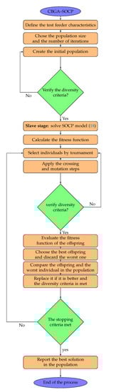 Flowchart of the Chu and Beasley genetic algorithm (CBGA)-second-order cone programming (SOCP) approach for the optimal sizing and placement of D-STATCOMs in electrical distribution grids.