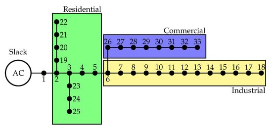 Grid configuration for the IEEE 33-bus system, with different shaded areas representing different types of load.