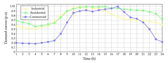 The shaded areas in Figure 3 represent the types of consumer connected to the distribution grid, i.e., industrial, commercial, and residential loads. Each of the per-unit demand curves are depicted in Figure 4.