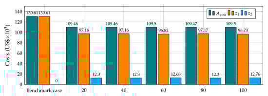 The objective function defined in Equation (1) was evaluated using the parameters presented in Table 3. Note that some of these values have been taken from [] and []. It is also important to highlight that to evaluate the objective function regarding the annual costs of the installation of D-STATCOMs, i.e., , the values of the variable must be defined in MVAr [].