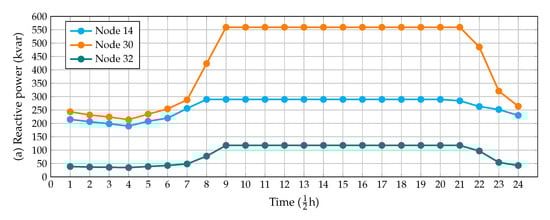 To verify the effectiveness of the usage of dynamic reactive power compensators (D-STATCOMs) in electric distribution networks, when compared with classical fixed-step capacitor banks, we present in Figure 6 the daily output in the D-STATCOMs for the optimal solution reported in Table 5.
