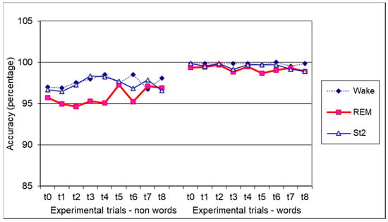 As regards accuracy (i.e., percentage of correct responses), we performed a three-way ANOVA with experimental condition (wake, awakening from REM, and awakening from St.2), experimental trial (from T0 to T8), and target (words and non-words) as variables (see Figure 1). As regards the first two factors, no significant effects were found. On the contrary, we observed a significant difference between the accuracy of words (99.5%) and non-words (96.9%) (F(1,17) = 26.91; p < 0.0001). No interactions reached statistical significance. In the analysis for the trial, we detected a significant effect at t2 for non-words (F(2,34) = 3,4; p < 0.05). No post-hoc comparisons were significant.