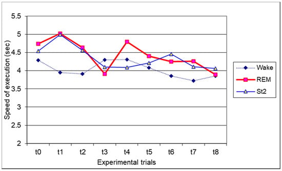 As regards the speed of execution, we considered the mean time (in seconds) of each correct sequence in the recall phases. The mean time for a correct sequence was 4.03 s for wake, 4.43 s for REM awakening, and 4.34 s for St2 awakening. The ANOVAs did not show any significant main effects or interactions (Figure 2). The trial by trial ANOVA did not show any significant results.