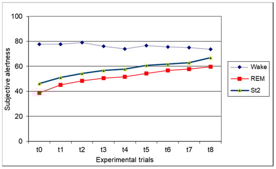 Data concerning subjective alertness are shown in Figure 3. The ANOVA on subjective alertness revealed that experimental condition reached significance (F(2,34) = 24.4, p < 0.00001). The wake condition obtained a higher subjective alertness score (mean = 76.18) in comparison with both REM awakening (mean = 51.45; p < 0.000001) and St.2 awakening (mean = 57.60; p < 0.0001) (Scheffé post-hoc test). A significant trial effect was also found (F(8,136) = 16.22, p < 0.0000001). The Scheffé post-hoc test showed that the mean score significantly and linearly increased from T0 to T8. The interaction between condition and trial also reached statistical significance (F(16,272) = 18.52, p < 0.0000001). In particular, the mean subjective alertness score for the wake condition at t0, t1, t2, t3, t4, t5, t6, and t7 was significantly higher in comparison with that of both the REM and St2 conditions. At t8, alertness in the wake condition was higher only in comparison to the REM condition. REM subjective alertness never significantly differed from that of St2.