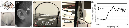 (a) Actuator used for the bone-conducted sound reproduction, (b) hairband-type fixing device of the actuator, (c) contact position of the actuator, (d,e) measurement settings of the excitation characteristics of the adopted actuator with the fixing device, and (f) measured frequency characteristics of the vibration acceleration exited by the actuator.