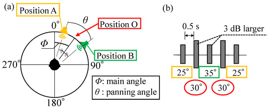 The panning method moves the reproduced sound image to the left and right to improve the human perception of sound localization. Figure 4 shows an overview of the panning method. The angle F from the front to the direction of O is the main angle, and the angle θ from the direction of position A to that of position B is the panning angle. The main angle Φ is fixed at every 30° in the horizontal plane, following the method of clock position. The sound for the direction of O was played back 3 dB louder than that for the directions of A and B, so that the subjects could distinguish the panning sound. The switching time between the signals was set to 0.5 s. In the present study, three panning angles, 10°, 20°, and 30°, were evaluated. The reproduced sound is a flashing sound that was generated by convolving the dry source of the flashing sound and the HRTFs measured with the HATS by KEMAR, provided by the Massachusetts Institute of Technology (MIT) [23]. Note that the flashing sound will be used in the main navigation system to guide the subjects in the target direction.