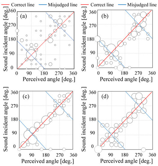 Results of sound localization tests. (a) θ = 0°, (b) θ = 10°, (c) θ = 20°, and (d) θ = 30°.