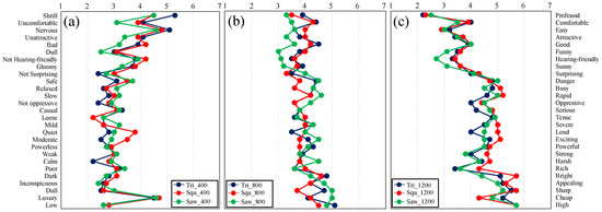 Average profile ratings obtained by the semantic differential (SD) test for (a) 400 Hz, (b) 800 Hz, and (c) 1200 Hz.