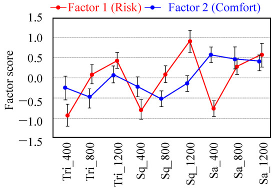 The experimental results obtained by the SD test are shown as profile ratings in Figure 6. These figures show the average values for the scores of all subjects. To identify the factors concerning the subjective impressions of the warning sound, factor analysis based on the Promax rotation was performed. The estimated results are shown in Table 4. As shown in the table, three factors, each of which has an eigenvalue of over 1.0, were extracted by following the Kaiser–Guttman criterion. The factors with high correlation are indicated by red characters. As shown in the table, each of the adjectives is categorized into factors. These results suggest that the participant impressions of the warning sound can be generally described using three factors: risk, discomfort, and timbre. Herein, to consider the important factors that can provide user safety and comfort, each of the warning sounds was evaluated through Factors 1 and 2. The factor scores of Factors 1 (risk) and 2 (discomfort) calculated based on the results of the factor analysis are illustrated in Figure 7.