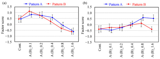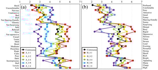 Average profile ratings obtained by the SD test for (a) Pattern A and (b) Pattern B.
