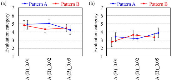 The experimental results obtained by the SD test are shown for the extent of danger and comfort in Figure 10a,b, respectively. As shown in Figure 10a, the scores for Patterns A and B slightly decrease as the off times increase, whereas the scores for A_0.01, A_0.02, and B_0.01 are almost the same (slightly higher than the score of 4, which was equivalent to the reference sound of B_0.1). The scores for A_0.01 and A_0.02 are almost the same because A_0.01 and A_0.02 are indistinguishable due to excessively fine on and off time intervals. On the other hand, as shown in Figure 10b, the scores for both Patterns A and B increase for the case in which the score is less than 4 as the off times increase.