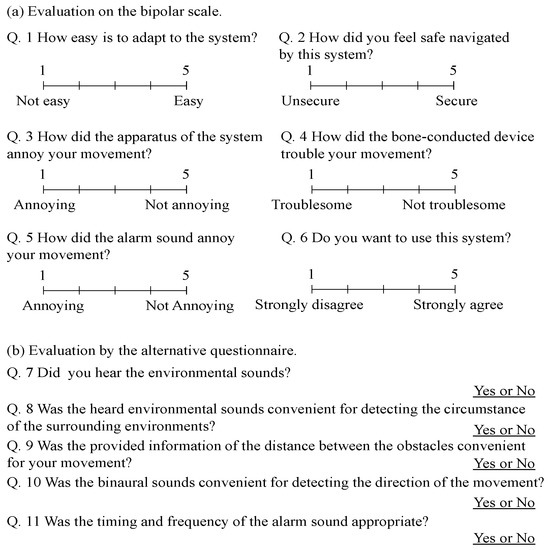 The navigation system should be able to reproduce immediately the warning sound when an obstacle appears in front of the walking user. Moreover, it is more appropriate for a visually impaired person to be able to perceive the direction of the obstacle based on the binaural warning sound. To design desirable warning sounds, human impressions of warning sounds with various time and frequency characteristics, which are reproduced by the bone-conduction device, are measured through subjective experiments. Since bone-conducted sound can be heard even while the ear canal is unblocked, background environmental sounds can also be heard simultaneously, and such sounds have acoustic effects on bone-conducted sounds. For this reason, the experiment was carried out by simultaneously wearing both the bone-conducted device and headphones.