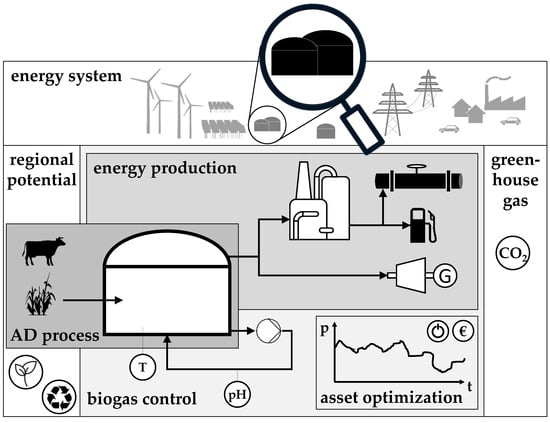 With anaerobic digestion (AD), the main transformation process from organic matter to biogas is a biological one. The complex processes of hydrolysis, acidogenesis, acetogenesis, and methanogenesis are well known and described [1]. AD works with various types of organic feedstock, such as municipal sludge from wastewater treatment plants, municipal solid waste, animal waste, algae, or energy crops. Some of those are constantly available, while others are subject to regional and seasonal restrictions. Main product of the anaerobic digestion is biogas, primarily methane and carbon dioxide (CO2). The side product is a nutrient-rich digestate. Biogas can be converted to different energy products, such as heat (by combustion), electricity and heat (combined heat and power plant: CHP), electricity (by turbines), natural gas (by the separation of CO2), or fuels (e.g., by increasing the methane fraction or CO2-assisted catalytic reforming) [2]. A common pathway for the energetic use of biogas is electricity and heat production in a CHP. The focus in many countries lies on the production of electricity. In Germany, for instance, the privileged feed-in of renewable electricity from biogas CHPs is regulated by the Renewable Energy Act [3]. In comparison to other renewable energy sources, electricity production from biogas is not weather-dependent. Biogas plants can produce electricity flexibly according to demand, by utilizing the possibility of storing feedstock and biogas [4]. This provides a distinguished role for biogas plants in the energy sector. Furthermore, biogas can also participate in the supply of heat and fuel where the share of renewable energies, for example, in Germany, it is much lower than for electricity. The shares of renewable energies for electricity, heat, and transport in Germany in 2019 were 37.8, 13.9, and 5.6%, respectively [5].