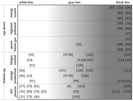 The performance of biogas plants as a result of AD, the possibility of controlling a full-scale biogas plant, the impact of fluctuating energy markets, and the behavior of energy production are modeled within different research fields, mostly on a scientific or technological level. Published models show a great variety both in methodical approach and in addressed research questions. Within this section, the reviewed papers are classified by their level of detail and complexity of the described AD model and categorized as white, gray, or black box model.