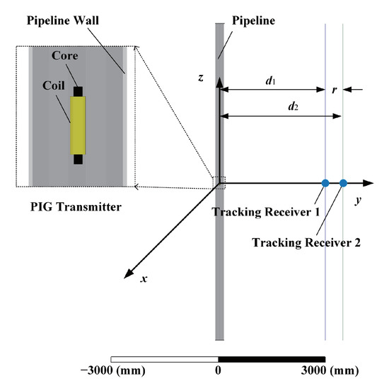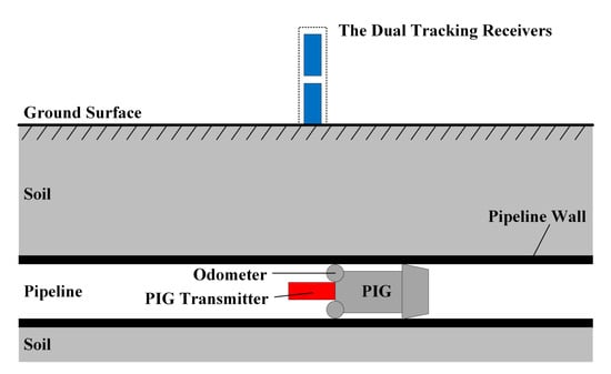 The tracking system works mainly as follows. First, the transmitter carried by the PIG constantly radiates an ELF magnetic field in the pipeline. The ELF magnetic field reaches the ground through the attenuation of the oil and gas, the pipeline wall, the soil, and the air. Then, the vertically distributed dual tracking receivers detect the magnetic field values at different heights on the y-axis when PIG passes. Last, the tracking system can use the characteristics of the radiation field to track the PIG.