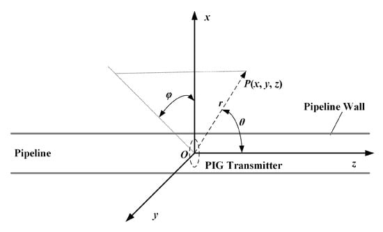 There is also another above-ground tracking method based on an extremely-low frequency (ELF) magnetic field, which has better positioning accuracy and stronger general applicability. PIG carries the transmitter, which can radiate the ELF magnetic field, while the tracking receiver above the ground locates PIG by detecting the ELF magnetic field signal [23]. The AGM based on the ELF magnetic signal has been widely used in practical engineering [24]. It is also suitable for tracking the PIG with unconventional shapes [25]. The most common way to analyze the ELF–AGM is the magnetic dipole model (MDM) method [26]. Qi established a MDM for the PIG transmitter, and proposed the pipeline global position system to realize long-distance tracking of the pipeline based on the principle of multi-satellite measurement [27]. Based on the x-axis and y-axis signals of the magnetic field of the transmitter, Piao gives an orthogonal search coils model, which is applied to the tracking of high-speed PIGs through the least square criterion and ternary decision trees [28,29].