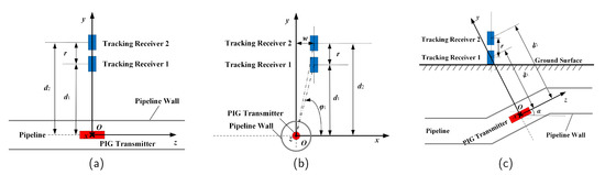 The normal case assumes that the tracking receivers are located directly above the pipeline, and the pipeline is parallel to the ground, as shown in Figure 3a. References that consider only one-dimensional tracking all assume that AGMs work in the normal case [26,27,28]. It is obvious that distances r, and meet the following relationship: