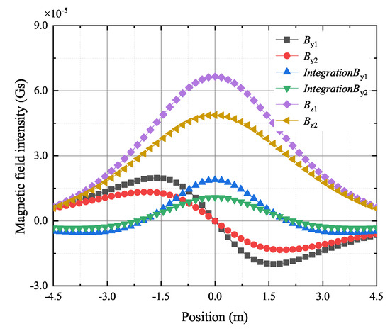 Based on the FEM model as shown in Figure 5, the dual tracking receivers have 1 m lateral offset, while is 3 m, is 4 m. Therefore, the magnetic field measured by tracking receivers, shown as Figure 7, are the radiated magnetic field of the transmitting coil on the line ((1, 3, −4.5), (1, 3, 4.5)) and the line ((1, 3.5, −4.5), (1, 3.5, 4.5)) in meter. In a similar manner as the normal case, follows the characteristics of origin symmetry while follows the characteristics of axisymmetric. Furthermore, the coils used for measuring can be omitted by the MFSI method.