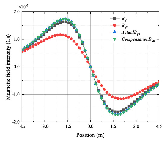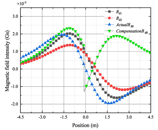 Based on the FEM model as shown in Figure 5, there are 30° pitch angles for the tracking receivers, while is 3 m and is 4 m. The magnetic fields measured by tracking receivers, shown as Figure 8, are the radiated magnetic field of the transmitting coil on the line ((0, 3, −4.5), (0, 3, 4.5)) and the line ((0, 3.5, −4.5), (0, 3.5, 4.5)) in meters. Due to the pitch angle, the measured magnetic field is the combination of and of the original magnetic field, and the results in the pitch angle case are different from the two cases discussed earlier. The measured magnetic field does not meet the characteristics of origin symmetry anymore. In addition, there are obvious differences between the measured magnetic field and the original magnetic field in the amplitude and the position corresponding to the maximum amplitude, which can cause high error in positioning methods that directly use data . In particular, the position offsets corresponding to the zero magnetic field points of receivers 1 and 2 are 74.10 cm and 48.45 cm, respectively. The offset of the zero magnetic field point will cause an unacceptable error in the traditional ELF-AGMs based on the zero magnetic field point. In contrast, is the compensated magnetic field by the MFSI method. It can be found that the zero magnetic field point of has been compensated from 74.10 cm to 10.45 cm, which greatly improves tracking accuracy. The specific results of MFSI algorithm are shown in Table 3.