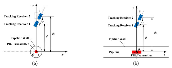 where and are the positions corresponding to the maximum and minimum values of the magnetic field intensity under the distance and , respectively. is the initial calculated value distance between the PIG transmitter and the tracking receivers in the x-axis direction. Furthermore, the nomenclature of the variables in the equations is listed in the Appendix A.